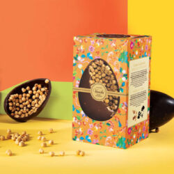 Uovo di Pasqua al cioccolato fondente con sorpresa ricoperto al suo interno da una distesa di Nocciole Piemente IGP intere: un delizioso scrigno di cioccolata che racchiude un tesoro goloso. La croccantezza delle nocciole si abbina così in modo sublime al gusto avvolgente del cioccolato fondente. L'uovo è contenuto in un'elegante scatola con colorate stampe floreali.